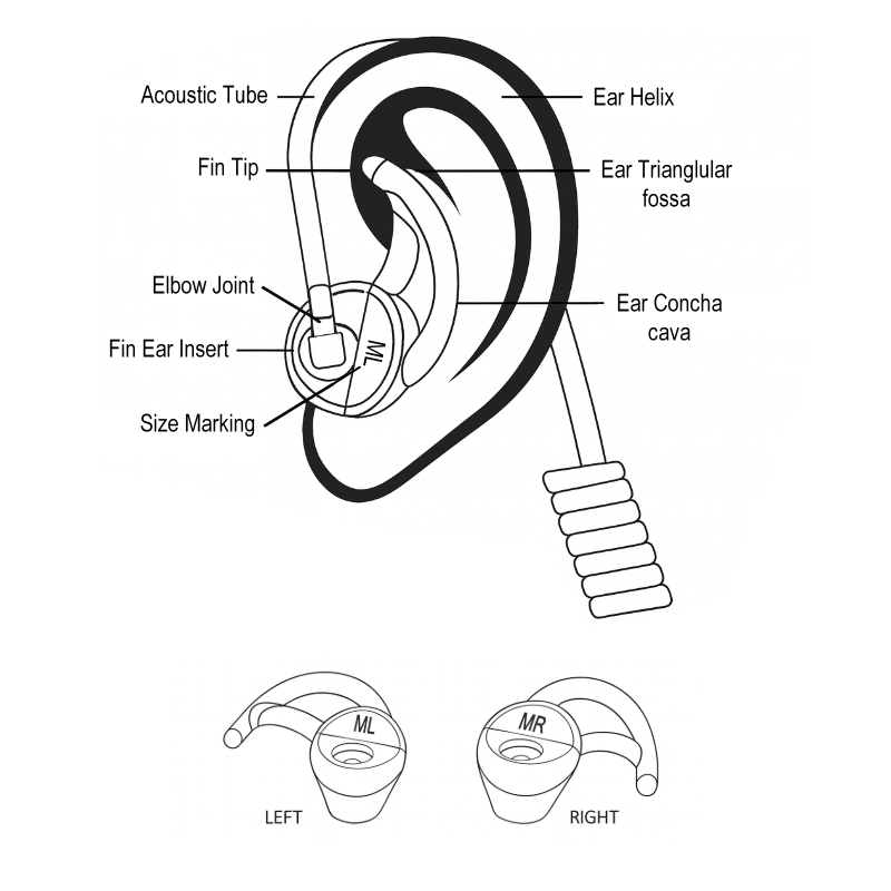 Our most discreet earpiece. The FIN earpiece ensures a secure fit. The soft FIN fits easily inside the contours of the ear keeping it firmly in place even during evasive movements. The cone shape fits into the opening of the ear canal without penetrating the inside of the ear for superior comfort. This semi-translucent ear tip is comprised of Shore 25 Silicone making it one of the softest ear tips available. Installation: Insert the acoustic tube elbow into the outside connector hole of the ear mold earpiece. Insert the ear mold earpiece sound stem into the ear canal with the larger "teardrop" end of the earpiece upward. Fit the half-round section of the earpiee into the earfold (natural grove) surrounding the ear canal. It is very important to choose the size of your earmold correctly... the following options are available: SEC-FIN-SL, Small Left SEC-FIN-ML, Medium Left SEC-FIN-LL, Large Left SEC-FIN-SR, Small Right SEC-FIN-MR, Medium Right SEC-FIN-LR, Large Right